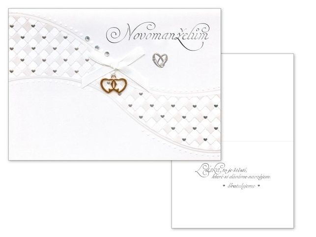 Svatební přání s textem - Svatba je příjemná a mimořádná událost a je začátkem nové etapy života. Mezi svatebními dary by nikdy nemělo chybět i přání novomanželům. Udělejte radost novomanželům a věnujte jim přání k jejich svazku, díky kterému si vždy připomenou krásné začátky jejich manželství. Nápis je vyrytý stříbrným písmem a na přání je mašlička se srdíčky. Text na přední straně přání: Novomanželům Text uvnitř přání: Láska, to je štěstí, Které si dáváme navzájem, Gratulujeme Papír: pohlednicový karton 240 g Uvedená cena je za 1 ks. Přání je baleno v sáčku. Součástí přání je i obálka.