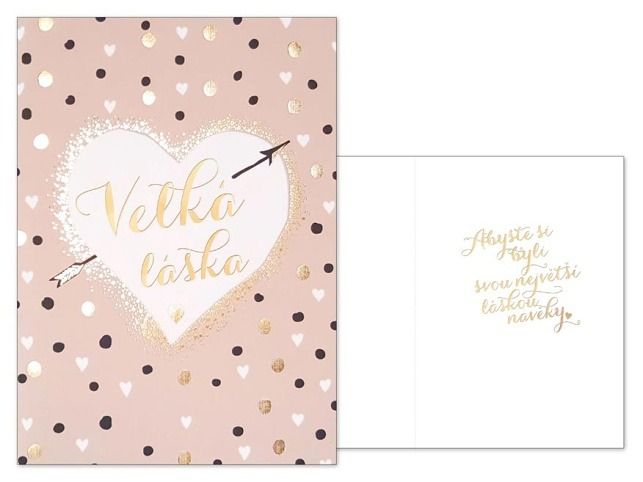 Svatební přání - Svatba je příjemná a mimořádná událost a je začátkem nové etapy života. Mezi svatebními dary by nikdy nemělo chybět i přání novomanželům. Udělejte radost novomanželům a věnujte jim přání k jejich svazku, díky kterému si vždy připomenou krásné začátky jejich manželství. Nápis je vyrytý zlatým písmem a přání zdobí srdíčka. Text na přední straně přání: Velká láska Text uvnitř přání: Abyste si byli svou největší láskou navěky. Nápis je ražený zlatou folií, součástí přání je obálka. Přání je na obale označené doporučenou prodejní cenou.