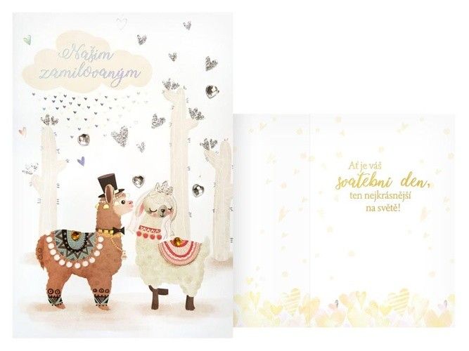 Svatební přání - Svatba je příjemná a mimořádná událost a je začátkem nové etapy života. Mezi svatebními dary by nikdy nemělo chybět i přání novomanželům. Udělejte radost novomanželům a věnujte jim přání k jejich svazku, díky kterému si vždy připomenou krásné začátky jejich manželství. S motivem zamilovaných lam. Text na přední straně přání: Našim zamilovaným Text uvnitř přání: Ať je vás svatební den, ten nejkrásnější na světě! Papír: pohlednicový karton 240 g Uvedená cena je za 1 ks. Přání je baleno v sáčku. Součástí přání je i obálka.