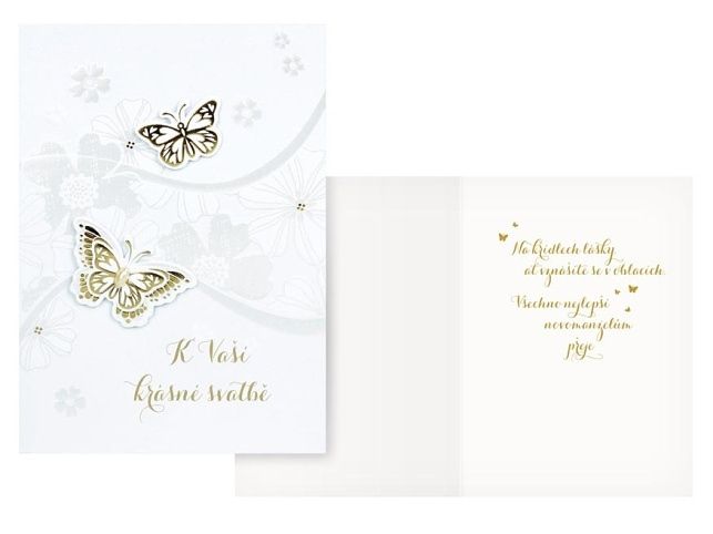 Svatební přání - Svatba je příjemná a mimořádná událost a je začátkem nové etapy života. Mezi svatebními dary by nikdy nemělo chybět i přání novomanželům. Udělejte radost novomanželům a věnujte jim přání k jejich svazku, díky kterému si vždy připomenou krásné začátky jejich manželství. Text na přední straně přání: K Vaši Krásné svatbě Text uvnitř přání: Na křídlech lásky, ať vznášíte se v oblacích. Všechno nejlepší novomanželům přeje Přání je baleno v sáčku, součástí balení je i dopisní obálka.