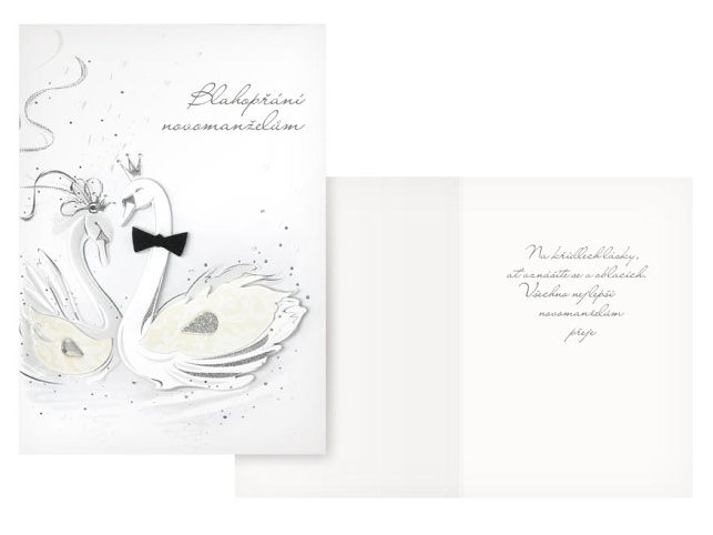 Svatební přání - Svatba je příjemná a mimořádná událost a je začátkem nové etapy života. Mezi svatebními dary by nikdy nemělo chybět i přání novomanželům. Udělejte radost novomanželům a věnujte jim přání k jejich svazku, díky kterému si vždy připomenou krásné začátky jejich manželství. Text na přední straně přání: Blahoprání Novomanželů Text uvnitř přání: Na křídlech lásky, ať vznášíte se v oblacích. Všechno nejlepší novomanželům přeje Přání je baleno v sáčku, součástí balení je i dopisní obálka.