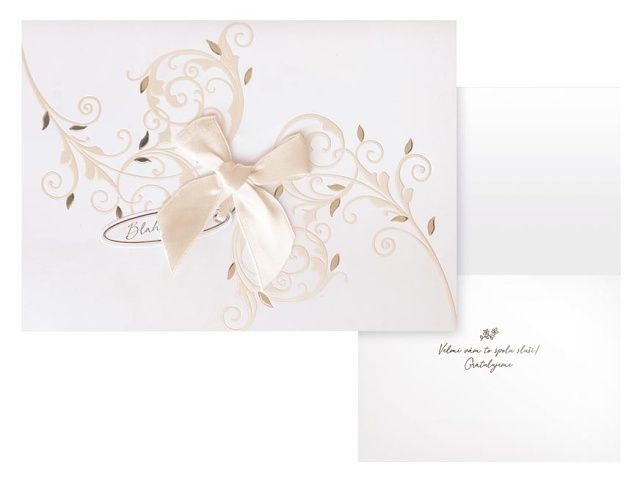 Svatební přání s textem - Svatba je příjemná a mimořádná událost a je začátkem nové etapy života. Mezi svatebními dary by nikdy nemělo chybět i přání novomanželům. Udělejte radost novomanželům a věnujte jim přání k jejich svazku, díky kterému si vždy připomenou krásné začátky jejich manželství. Text na přední straně přání: Blahopřejeme Text uvnitř přání: Velmi vám to spolu sluší Gratulujeme Papír: pohlednicový karton 240 g Uvedená cena je za 1 ks. Přání je baleno v sáčku. Součástí přání je i obálka.