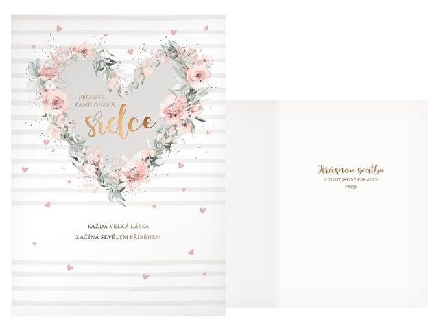 Přání svatební - Svatba je krásná, příjemná a mimořádná událost a je začátkem nové etapy života. Mezi svatební dary by tedy nemělo chybět i krásné svatební přání, které udělá určitě velkou radost novomanželům. Text na přední straně přání: Pro dvě zamilovaná srdce Každá velká láska začíná skvělým příběhem. Text uvnitř přání: Krásnou svatbu a život jako v pohádce přeje Přání: pohlednicový karton 240g Přání je baleno v sáčku, součástí balení je i dopisní obálka.