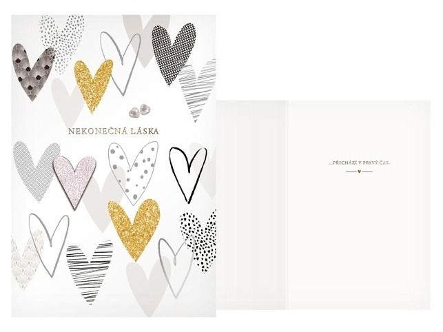 Přání svatební - Svatba je krásná, příjemná a mimořádná událost a je začátkem nové etapy života. Mezi svatební dary by tedy nemělo chybět i krásné svatební přání, které udělá určitě velkou radost novomanželům. Novomanželům: Nekonečná láska Text uvnitř přání: …přichází v pravý čas. Papír: pohlednicový karton 240g Přání je baleno v sáčku, součástí balení je i dopisní obálka.