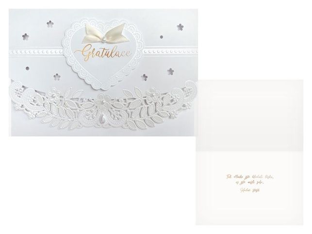 Svatební přání v sobě nese jemnost, romantiku a pečlivě propracované detaily. Krajkové motivy s květinovými vzory působí elegantně a zanechávají dojem luxusní ruční práce. Uvnitř se skrývá zlatý text s decentním poselstvím, který doplňuje prostor pro váš osobní vzkaz. Celkový design přání zachycuje kouzlo svatebního dne a připomíná jeho neopakovatelnou atmosféru. Skvěle vystihuje význam této výjimečné události a stává se krásnou památkou na chvíle plné lásky a radosti. Text na přední straně přání: Gratulace Text uvnitř přání: Tak dlouho jste hledali lásku, až jste našli sebe. Hodně štěstí Papír: pohlednicový karton 240 g Přání je baleno v sáčku. Součástí přání je i obálka. Uvedená cena je za 1 ks.