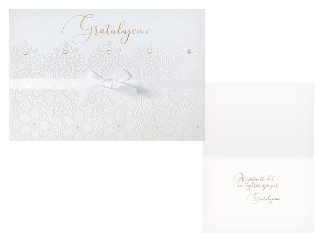 Svatební přání s jemným krajkovým motivem a saténovou mašlí je ideálním způsobem, jak novomanželům pogratulovat k jejich významnému dni. Dodává svatbě osobní rozměr a zůstává krásnou vzpomínkou na tento výjimečný okamžik. Text na přední straně přání: Gratulujeme Text uvnitř přání: ať zůstanete dál ten nejkrásnější pár. Gratulujeme. Papír: pohlednicový karton 240 g Přání je baleno v sáčku. Součástí přání je i obálka. Uvedená cena je za 1 ks.