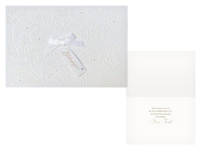 Svatební přání s jemným krajkovým motivem a saténovou mašlí je ideálním způsobem, jak novomanželům pogratulovat k jejich významnému dni. Dodává svatbě osobní rozměr a zůstává krásnou vzpomínkou na tento výjimečný okamžik. Text na přední straně přání: Blahopřejeme Text uvnitř přání: Až se zvony rozeznějí, my Vám všichni budem přát, ať životem Vás provázejí, ta tři slůvka: Mám tě rád. Papír: pohlednicový karton 240 g Přání je baleno v sáčku. Součástí přání je i obálka. Uvedená cena je za 1 ks.