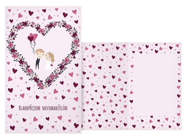 Přání svatební - Krásné svatební přání pro novomanžele s krásným obrázkem, který je určitě potěší. Text na přední straně: Blahopřejeme novomanželům Text uvnitř přání: Bez textu Papír: pohlednicový karton Přání je baleno v sáčku, součástí balení je i dopisní obálka