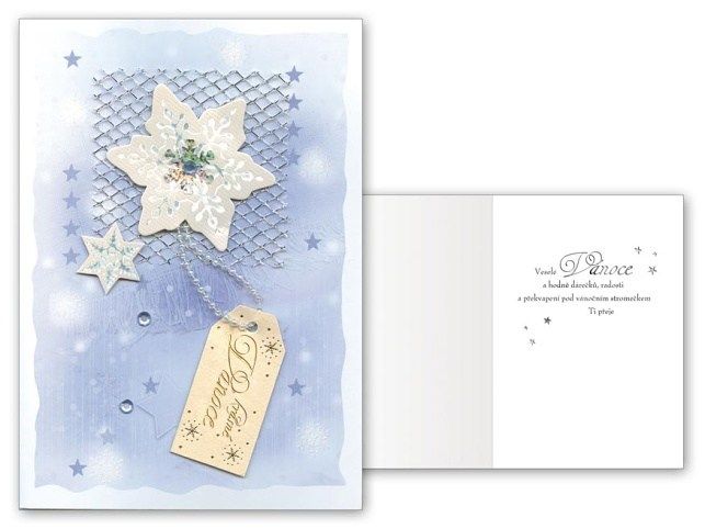 Přání Vánoční - V posledních letech se posílají Vánoční přání spíše jako SMS nebo mailem. Avšak tradiční tištěné přání je daleko osobnější a navíc k němu můžete přidat i vlastnoruční podpis. Nezapomeňte poslat krásné Vánoční přání Vašim známým. Určitě je potěší to, že jste si na ně vzpomněli. Přání je s motivem vločky. Text na přední straně přání: Krásné Vánoce Text uvnitř přání: Veselé Vánoce a hodně dárků, radosti a překvapení pod vánočním stromečkem ti přeje Papír: pohlednicový karton 240 g Přání je baleno v sáčku, součástí balení je i dopisní obálka.