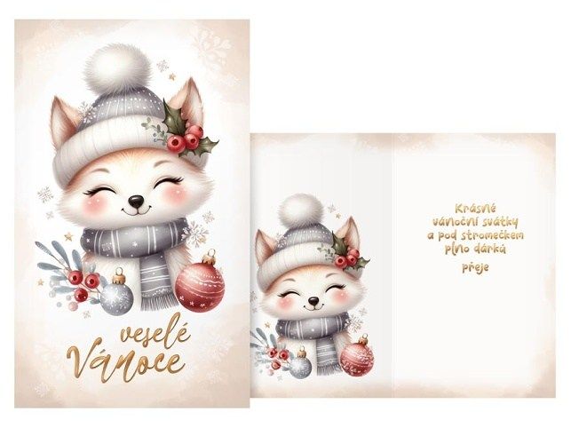 Vánoční přání malé. Vánoční přání je milý způsob, jak během svátků potěšit své blízké a přátele. Můžeme jím vyjádřit svou vděčnost, radost a přátelství, a to i na dálku, když se nemůžeme sejít osobně. Kromě přání krásných Vánoc bývá zvykem popřát i štěstí a úspěchy do nového roku. Je to tradiční gesto, kterým lidé šíří radost a pozitivní náladu. Text na přední straně: Veselé Vánoce Text uvnitř přání: Krásné vánoční svátky a pod stromečkem plno dárků přeje Papír: pohlednicový karton Přání je baleno v sáčku, součástí balení je i dopisní obálka. Uvedená cena je za 1 ks.