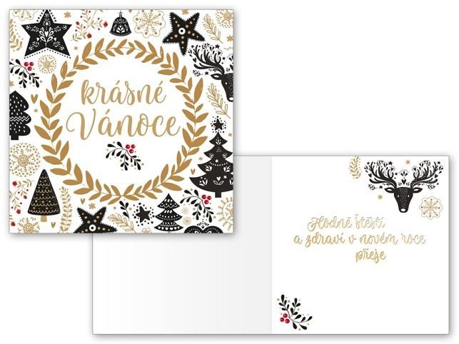 Přání Vánoční - V posledních letech se posílají Vánoční přání spíše jako SMS nebo mailem. Tradiční tištěné přání je, ale daleko osobnější a navíc k němu můžete přidat i vlastnoruční podpis. Nezapomeňte poslat krásné Vánoční přání Vašim známým. Určitě je potěší to, že jste si na ně vzpomněli. Text na přední straně přání: Krásné Vánoce Text uvnitř přání: Hodně štěstí a zdraví v novém roce přeje Papír: pohlednicový karton 240 g Přání je baleno v sáčku, součástí balení je i dopisní obálka.