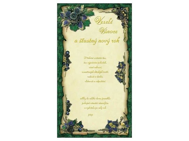 Přání Vánoční - V posledních letech se posílají Vánoční přání spíše jako SMS nebo mailem. Tradiční tištěné přání je, ale daleko osobnější a navíc k němu můžete přidat i vlastnoruční podpis. Nezapomeňte poslat krásné Vánoční přání Vašim známým. Určitě je potěší to, že jste si na ně vzpomněli. Text na přední straně: Veselé Vánoce a šťastný nový rok Přichází sváteční čas, čas vyprávění pohádek, vůně cukroví, rozzářených dětských tváří, radosti z dárků, vlídnosti a odpuštění. Aby do celého domu pronikla pokojná vánoční atmosféra a vydržela po celý rok přeje Text uvnitř přání: Bez textu Papír: pohlednicový karton 240 g Přání je baleno v sáčku, součástí balení je i dopisní obálka.