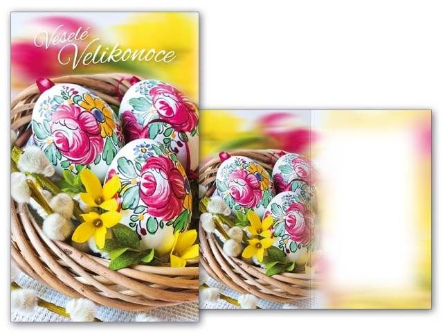 Velikonoční přání bez textu uvnitř. Blahopřání s obrázkem kraslic. Text na přední straně přání: Veselé Velikonoce Text uvnitř přání: Bez textu. Papír: pohlednicový karton 240 g Přání je baleno v sáčku, součástí balení je i dopisní obálka