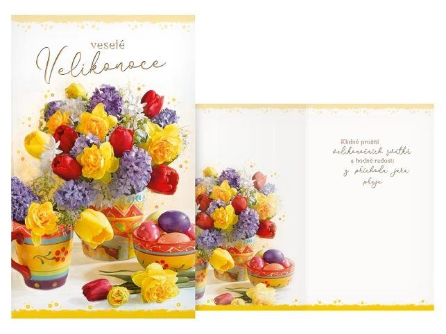 Velikonoční přání s textem uvnitř. Přání je s motivem jarních květů a kraslic. Potěšte své blízké vkusným přáním a popřejte jim krásné jarní svátky. Text na přední straně přání: veselé Velikonce Text uvnitř přání: Klidné prožití velikonočních svátků a hodně radosti z příchodu jara přeje Papír: pohlednicový karton 240 g Přání je baleno v sáčku, součástí balení je i dopisní obálka. Uvedená cena je za 1 ks.
