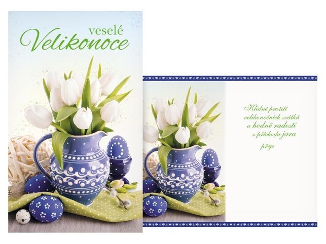 Bílé tulipány v modré keramické váze a zdobená vajíčka tvoří jemný jarní motiv, který na první pohled navazuje atmosféru Velikonoc. Toto velikonoční přání působí uklidňujícím dojmem a je vhodné pro všechny, kdo mají rádi tradiční, ale svěží motivy. Uvnitř je tištěné přání, které doplňuje motiv a dotváří celé sdělení. Text na přední straně: Veselé Velikonoce Text uvnitř přání: Klidné prožití velikonočních svátků a hodně radosti z příchodu jara přeje Papír: pohlednicový karton Přání je baleno v sáčku, součástí balení je i dopisní obálka. Uvedená cena je za 1 ks.
