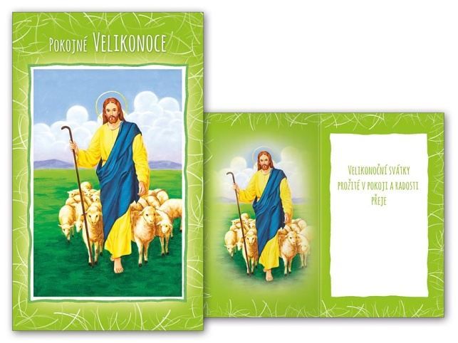 Velikonoční přání s textem uvnitř. Přání s biblickým výjevem. Text na přední straně přání: Pokojné Velikonoce Text uvnitř přání: Velikonoční svátky prožité v pokoji a radosti přeje Papír: pohlednicový karton 240 g Přání je baleno v sáčku, součástí balení je i dopisní obálka