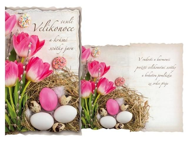 Velikonoční přání s textem uvnitř. Blahopřání s obrázkem tulipánů a kraslic. Text na přední straně přání: Veselé velikonoce a krásné svátky Jara Text uvnitř přání: V radosti a harmonii prožité velikonoční svátky a bohatou pomlázku ze srdce přeje Papír: pohlednicový karton 240 g Přání je baleno v sáčku, součástí balení je i dopisní obálka