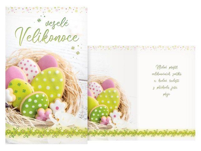 Velikonoční přání s textem uvnit. Blahopřání je s obrázkem kraslic v podobě sladkých perníčků. Potěšte své blízké přáním a popřejte jim krásné jarní svátky. Text na přední straně: veselé Velikonoce Text uvnitř přání: Bez textu Klidné prožití velikonočních svátků a hodně radosti z příchodu jara přeje Papír: pohlednicový karton Přání je baleno v sáčku, součástí balení je i dopisní obálka. Uvedená cena je za 1 ks.