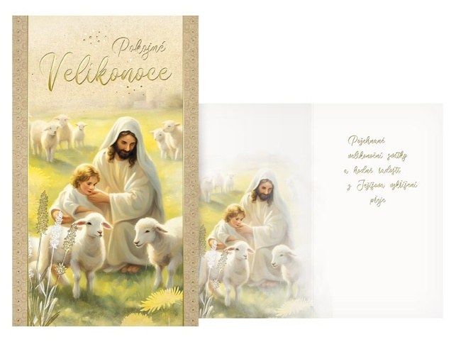 Velikonoční přání s textem uvnit. Blahopřání je s náboženským motivem. Potěšte své blízké přáním a popřejte jim krásné jarní svátky. Text na přední straně: Pokojné Velikonoce Text uvnitř přání: Bez textu Požehnané velikonoční svátky a hodně radosti z Ježíšova vzkříšení přeje Papír: pohlednicový karton Přání je baleno v sáčku, součástí balení je i dopisní obálka. Uvedená cena je za 1 ks.