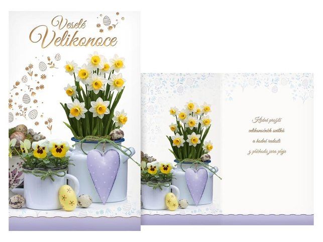 Přivítejte jaro s elegantním velikonočním přáním, které vnese do svátků kouzelnou atmosféru! Jemný motiv narcisů v kombinaci s rozkvetlými maceškami, ozdobenými vajíčky a láskyplným detailem fialového srdíčka přináší harmonii přírody a velikonoční pohody. Uvnitř přání najdete milý text přání, který dokonale vyjádří vaše srdečné velikonoční pozdravy. Skvělá volba, jak potěšit své blízké a sdílet radost z příchodu jara i kouzlo velikonočních tradic. Text na přední straně přání: Veselé Velikonoce Text uvnitř přání: Klidné prožití velikonočních cvátků a hodně radosti z příchodu jara přeje Papír: pohlednicový karton 240 g Přání je baleno v sáčku, součástí balení je i dopisní obálka. Uvedená cena je za 1 ks.