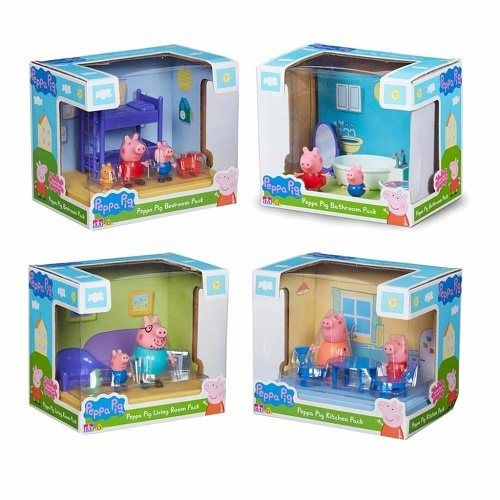 Domácnost hrací sad Prasátko Peppa – můžete si vybrat ze čtyř hracích sad – obývací pokoj, dětský pokoj, kuchyně a koupelna. Sada obsahuje dvě figurky 8cm a 5 cm.