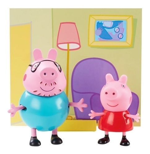 Prasátko Peppa – dvě tématické figurky s pozadím dětský pokoj, kuchyně, obývací pokoj. Velikost figurek – 8 cm a 5 cm.