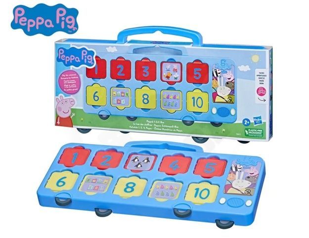 Naučte se počítat s prasátkem Peppou a zábavným autobusem 1–2–3. Každé otočné okénko zobrazuje číslo na jedné straně s odpovídajícím počtem znaků a předmětů na zadní straně, které mohou malí děti převrátit a zapamatovat si je. Rukojeť na horní straně znamená, že jej mohou nosit s sebou, ať jdou kamkoli, zatímco budou nadále rozvíjet své dovednosti počítání a počítání.