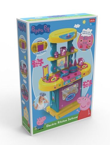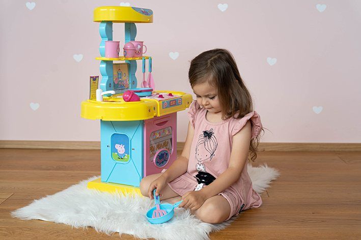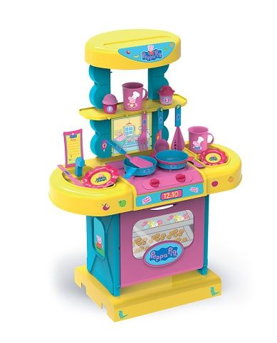 Kuchyňka pro malé děti s motivem prasátka Peppy. Výška kuchyňky 70 cm, výška pracovní plochy 45 cm. Součástí talířky, hrníčky, rendlíky, kuchyňské náčiní (obracečka, naběračka, metla, vidlička)- 15 ks. Vydává zvuk a svítí při zapnutí vařiče.