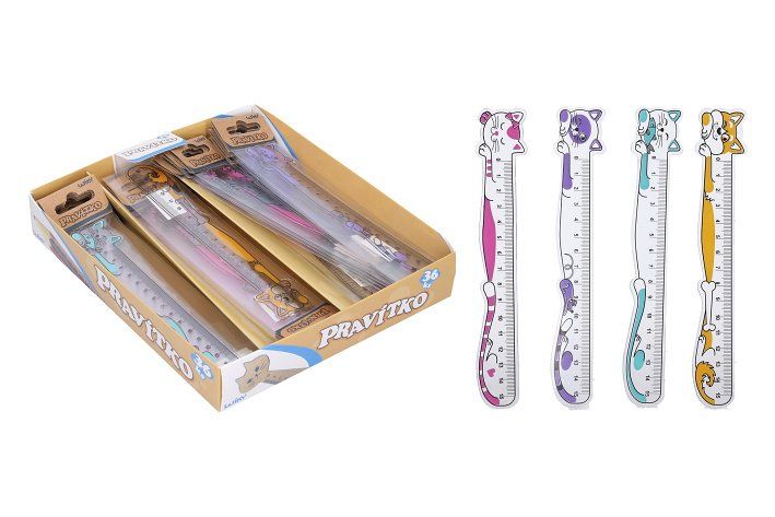 Pravítko 15 cm - Kočka, 4 barvy - fialová, růžová, tyrkysová, oranžová
