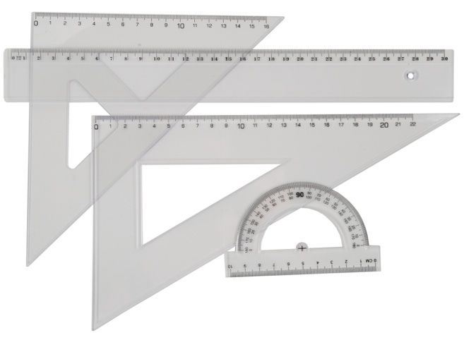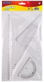 Trojúhelník s ryskou 45°/177 trojúhelník 60°/250 úhloměr 180°/100 s ryskou pravítko 30 cm čirý plast