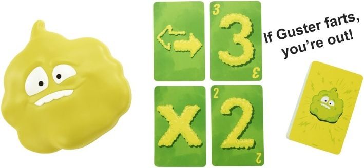 Při hře Prdící Guster™ se děti nebudou moci přestat smát! Plynový mrak Guster™ je plný střevních potíží a je připraven se roztrhnout! Umístěte ho doprostřed stolu a pak každému hráči rozdejte 3 karty. Pokud zahrajete kartu s číslem, stiskněte Gustera toli