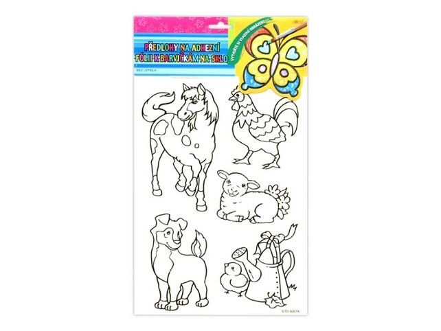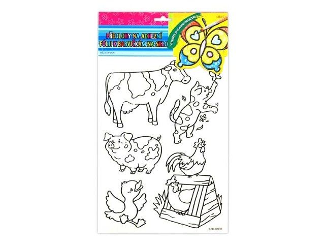 Předloha k barvičkám na sklo na adhezní fólii s motivy hospodářských zvířat. Jeden arch obsahuje 6 obrázků.