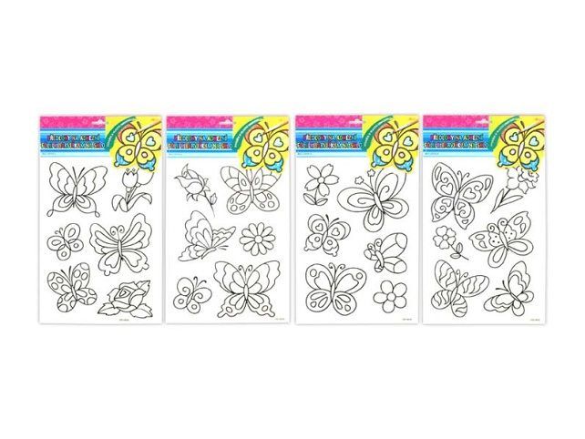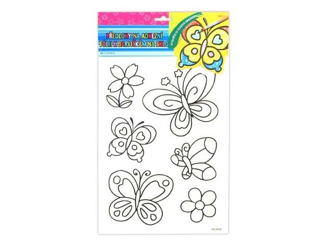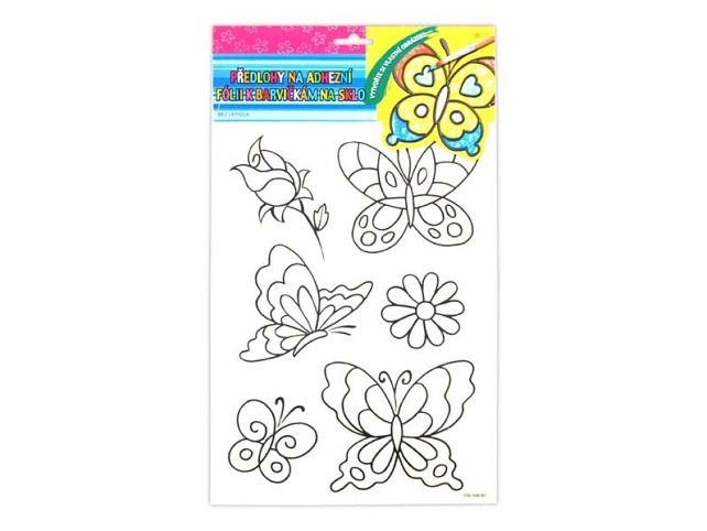 Předloha k barvičkám na sklo na adhezní fólii - Udělejte si pohodové odpoledne s dětmi, překreslete si obrázek pomocí těchto šablon, který si pak můžete umístit na Vaše okno. Provedení: motýlci NÁVOD: Vybarvěte a po uschnutí umístěte na čisté, případně navlhčené sklo, nebo jinou čistou a hladkou plochu. Obrázek elektrostaticky přilne. Můžete vybarvit barvičkami na sklo, fixami, vodovými barvami apod. Uvedená cena je za 1 ks.