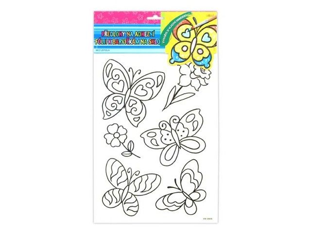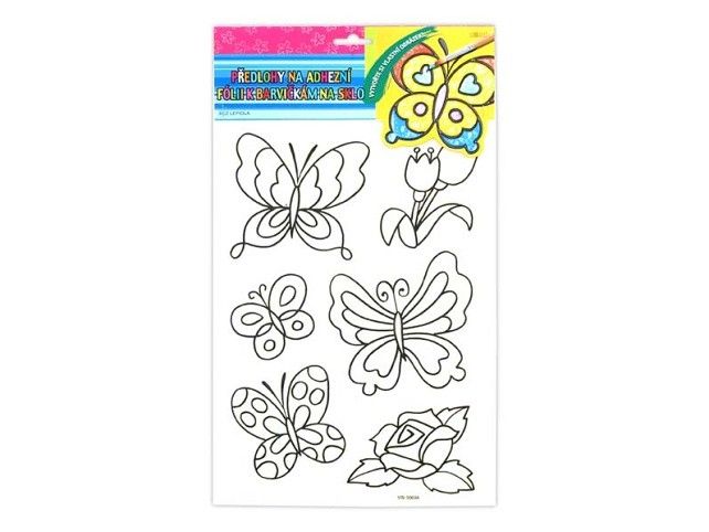 Předloha k barvičkám na sklo na adhezní fólii - Udělejte si pohodové odpoledne s dětmi, překreslete si obrázek pomocí těchto šablon, který si pak můžete umístit na Vaše okno. Provedení: motýlci NÁVOD: Vybarvěte a po uschnutí umístěte na čisté, případně navlhčené sklo, nebo jinou čistou a hladkou plochu. Obrázek elektrostaticky přilne. Můžete vybarvit barvičkami na sklo, fixami, vodovými barvami apod. Uvedená cena je za 1 ks.