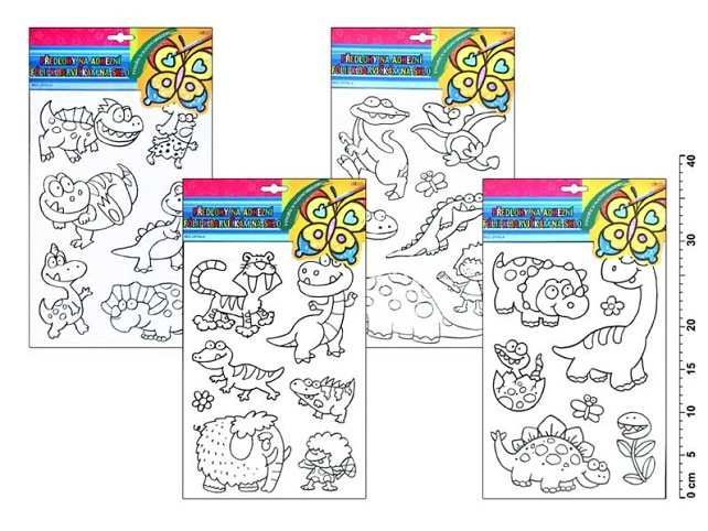 Předloha k barvičkám na sklo na adhezní fólii s motivy pravěku. Jeden arch obsahuje 6 obrázků. NÁVOD: Vybarvěte a po uschnutí umístěte na čisté, případně navlhčené sklo, nebo jinou čistou hladkou plochu. Obrázek elektrostaticky přilne. Můžete vybarvit barvičkami na sklo, fixami, vodovými barvami apod.