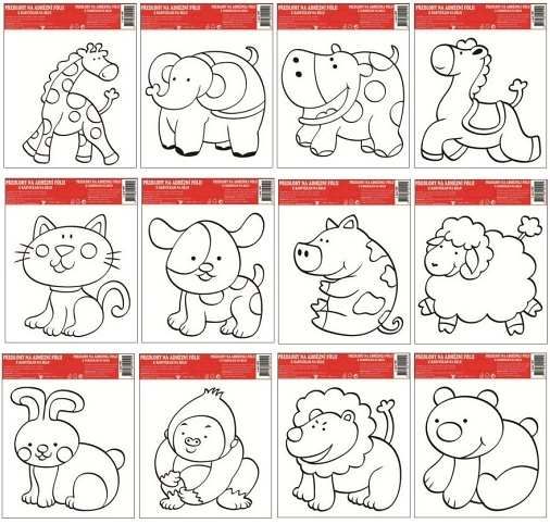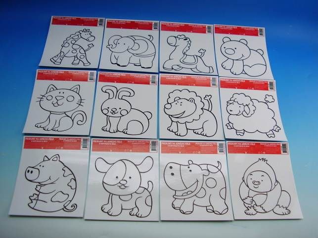 Předlohy na malování na sklo s vyvýšenou konturou zvířátka 12 motivů, 17x14cm ADHÉZNÍ FÓLIE ELEKTROSTATICKY PŘILNE K POVRCHU! Vybarvěte a po uschnutí umístěte na čisté, případně navlhčené sklo, zrcadlo, apod... Můžete vybarvit: barvičkami na sklo, fixami
