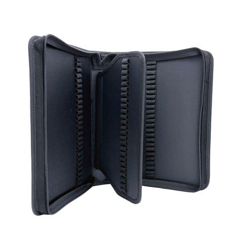 Černé prezentační pouzdro ve formátu A4 s portfoliem pro 100 kuličkových per. Levá strana obsahuje 25 úchopů, vnitřní klopová část má kapacitu 25 úchopů z každé strany a pravá strana nabízí dalších 25 úchopů. Rozměr portfolia je 21,7 x 28,6 x 4,5 cm. Pouzdro se zapíná na zip.