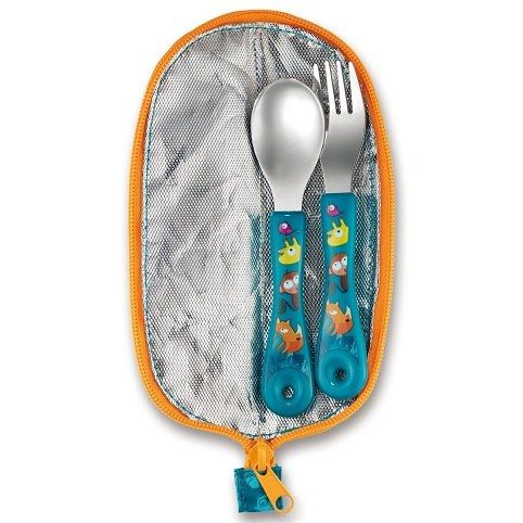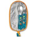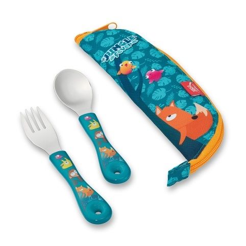 Příbor z nerezové oceli v pouzdře z kolekce Miniz v designu Jungle Fever. Pouzdro obsahuje lžičku a vidličku. Textilní pouzdro je na zip a jako vnitřní materiál má hliníkovou fólii pro snadné čistění. Příbory je možné mýt v myčce. Vhodné pro děti od 1 roku.