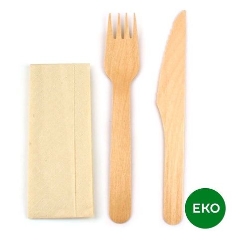 Praktická hygienicky balená sada dřevěného příboru s ubrouskem se hodí pro gastronomii v ekologickém podání. Set z kompletně kompostovatelného materiálu skvěle nahradí běžné plastové příbory.