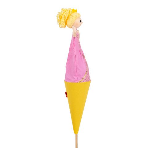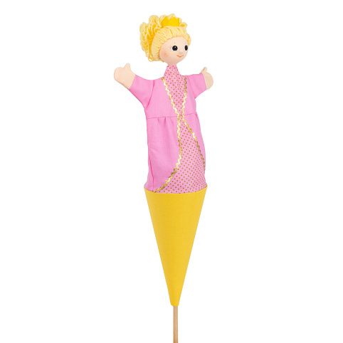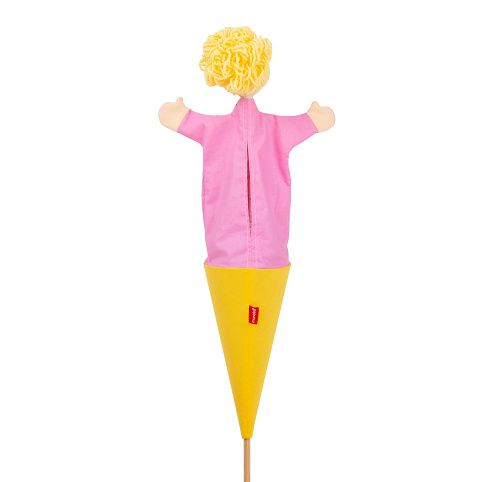 Kornoutový maňásek "3v1" = loutka+maňásek+schránka na drobnosti. Ovládá se dřevěnou tyčkou, kterou také schováte celou postavičku do kornoutu. Otvorem na zádech ovládáte ruce, tak jako u maňásků, nebo vložíte drobné dárky do kornoutu.