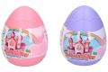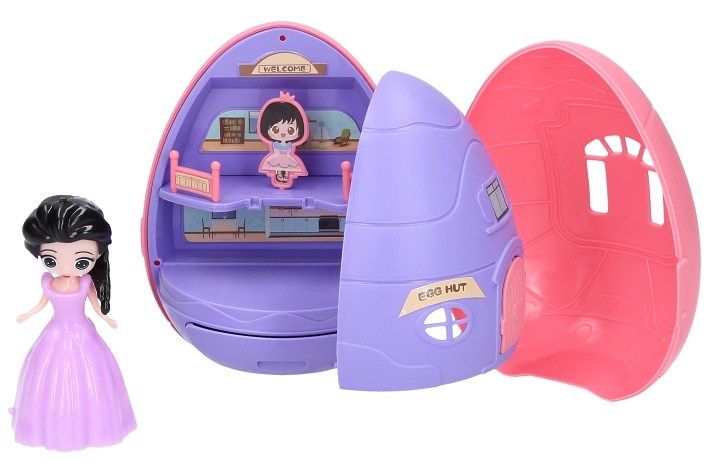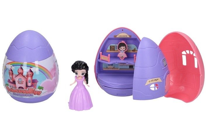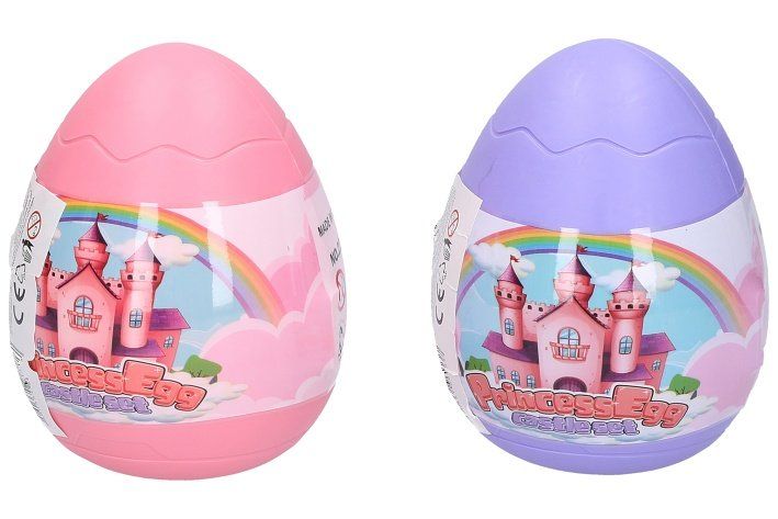 Princezna ve vajíčku. Velikost vajíčka 11 cm. Figurka princezny 8 cm. Vajíčko je otevírací. Uvnitř vajíčka je zámek pro princeznu. Obsahuje také samolepky na polepení zámku a šaty pro princeznu. Display box 6 ks. 2 varianty - růžová, fialová.