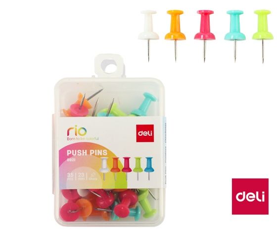 Připínáčky s barevnou hlavičkou v transparentní krabičce. Vhodné pro použití na korkové a textilní nástěnky, pro barevné vyznačení bodů a tras na mapách. Box obsahuje 35 kusů barevných připínáčků. Mix barev