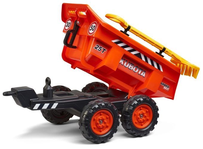 Přívěs za traktor čtyřkolový Kubota oranžový Maxi – lze tahat za traktorem. Součástí přívěsu je i lopata a hrábě s háčkem. Velikost přívěsu je 53×87×53 cm. Věk 3+. Všechny traktory Falk jsou testovány na 20kg – dle požadavků evropských norem.Z vysoce kvalitního a odolného plastu. Vyrobeno ve Francii.