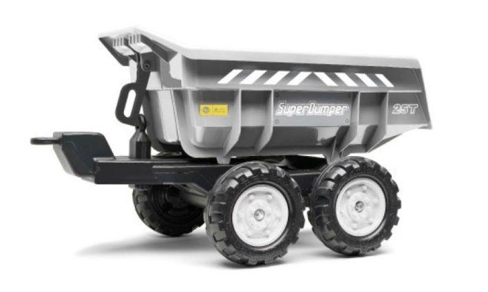 Přívěs „Super dumper“ čtyřkolová, šedé barvy. Kompatabilní s traktory Falk. Vyrobeno z kvalitního plastu ve Francii.