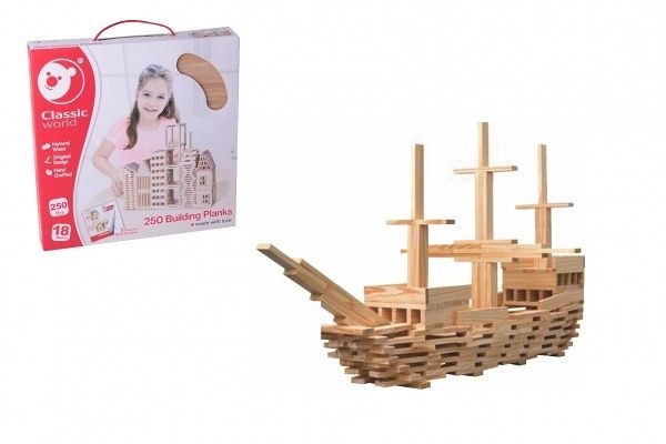Stavebnice vyrobená z kvalitního dřeva pro malé stavaře. Každý malý stavitel bude schopen stavět pomocí své fantazie z dřevěných kostek. Obsahuje 250 malých desek, které pomáhají dětem rozvíjet jejich představivost, motorické schopnosti a kreativitu. Díky velkému počtu prvků se dítě s hračkou příliš rychle nenudí a jistě mu bude hračka dlouho sloužit. Balení také obsahuje stavební návody.