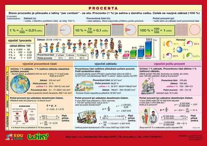 Zadní stranu tvoří především grafické vyjádření procent s příklady na výpočet procentuální části a procent.