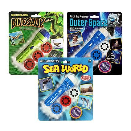 Projektor na promítání do ruky. Vyber si ze třech variant. Mořský život, vesmír nebo dinosauři. 24 barevných obrázků, které si děti mohou promítat po tmě na zeď.