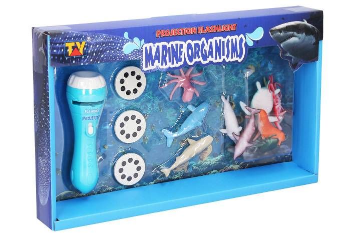 Projektor 24 snímků se zvířátky - Moře. Obsahuje projektor, 3 kotouče se snímky (celkem 24 snímků), 12 figurek mořských živočichů. Délka projektoru 11,5 cm, velikost zvířátek 5 - 6 cm. 3xAG13 baterie do projektoru součástí. Přepínač ON/OFF na projektoru. Zaostřovací prstenec na projektoru.
