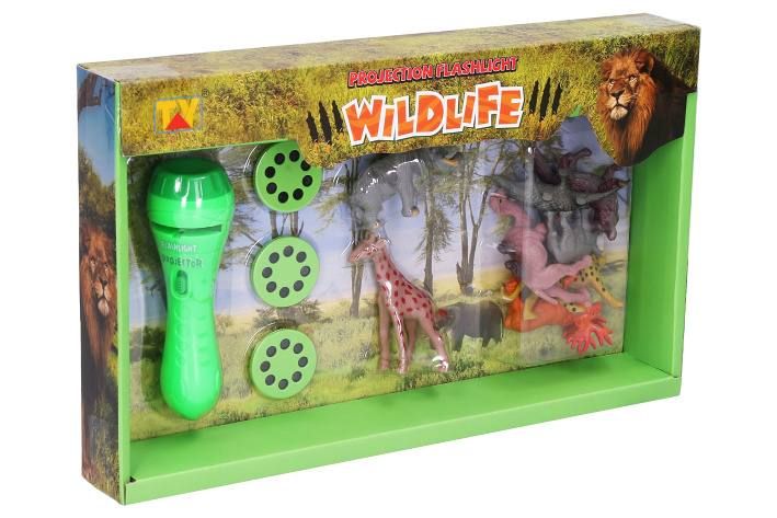 Projektor 24 snímků se zvířátky - Safari. Obsahuje projektor, 3 kotouče se snímky (celkem 24 snímků), 8 figurek safari zvířátek. Délka projektoru 11,5 cm, velikost zvířátek 5 - 7 cm. 3xAG13 baterie do projektoru součástí. Přepínač ON/OFF na projektoru. Zaostřovací prstenec na projektoru.