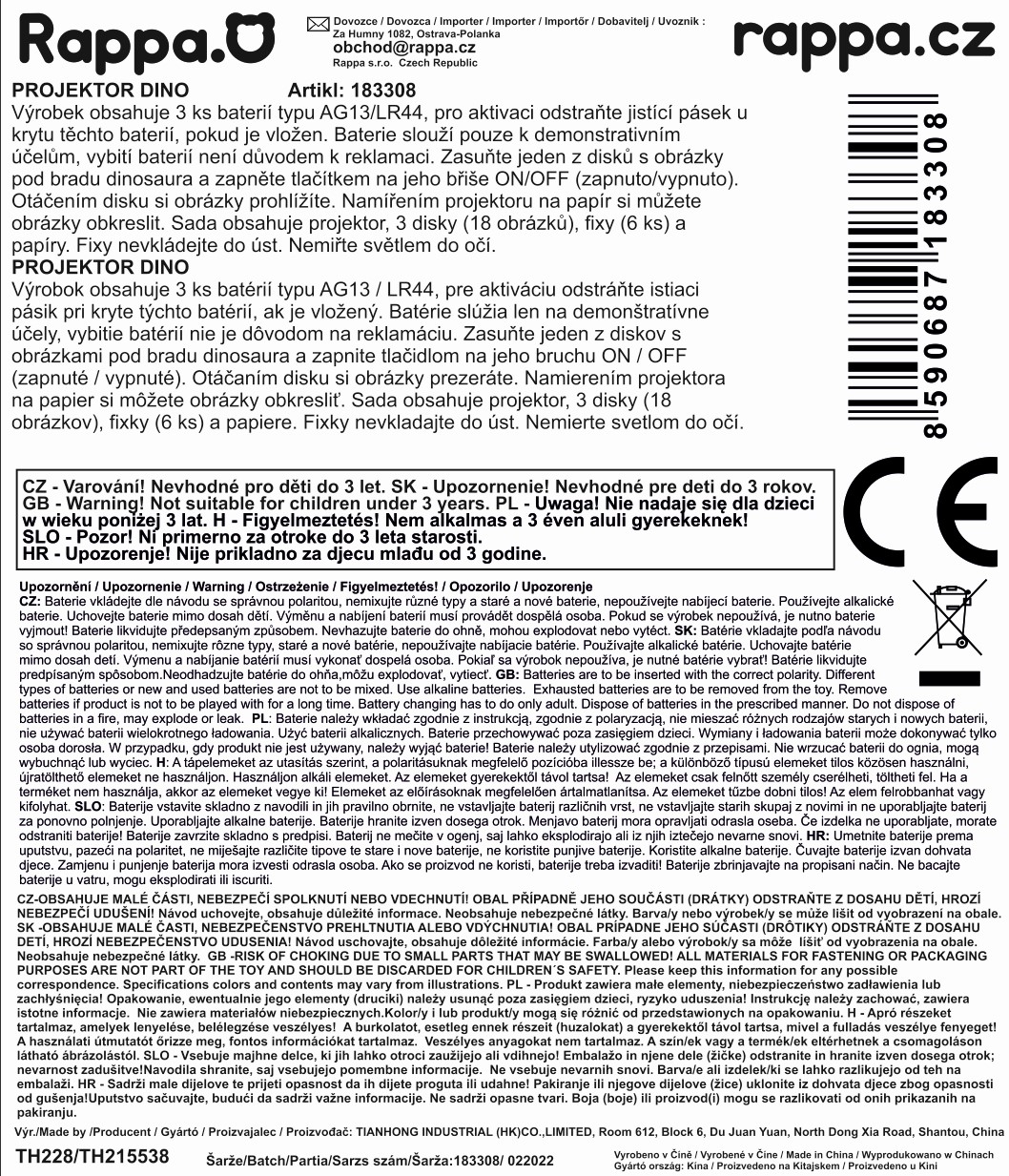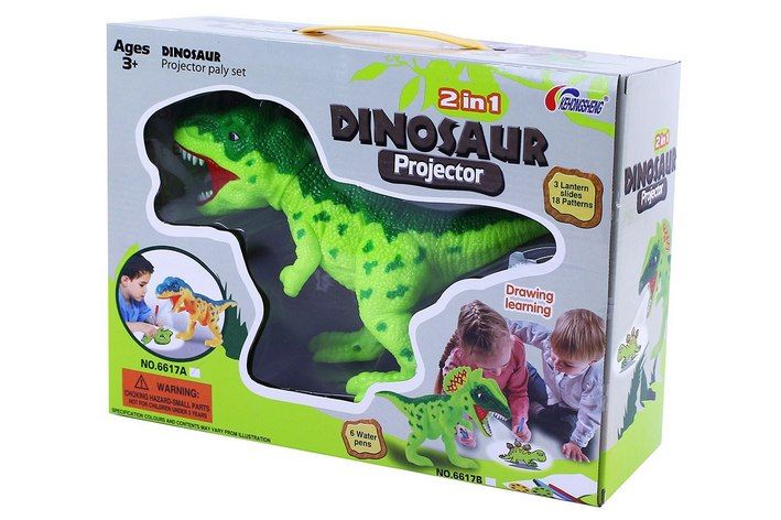 Parádní projektor dinosaurus. Při zapnutí projektoru a vložení jednoho ze tří diapozitivu (18 obrazků) se promítne obrázek. Když obrázek promítneš na papír můžeš ho obkreslit, součástí balení je i 6 ks fixů. Vyžaduje 3 ks baterií AG13, které jsou součástí balení.